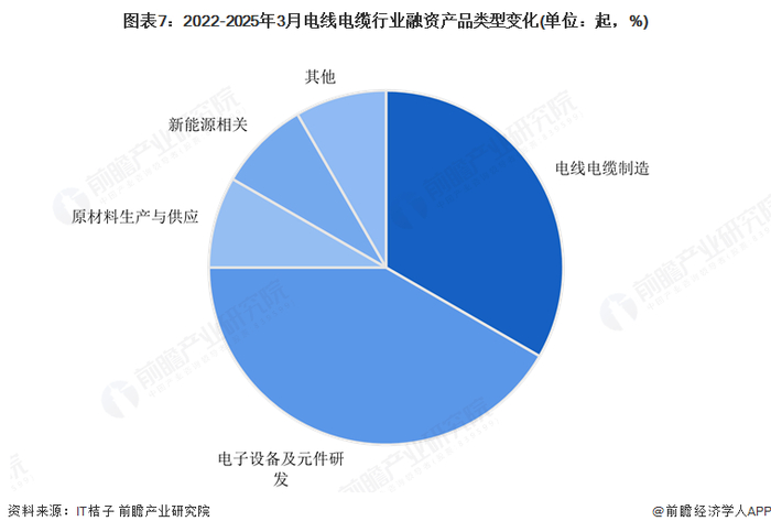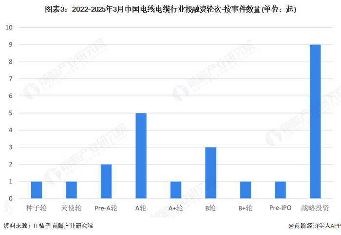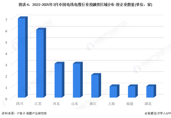 从电线电缆行业的企业融资区域来看,电线电缆行业发展具有显著的地区特征,不同地区融资状况差异很大。2022-2025年3月获融资的企业中,仅8省(市)地区企业获得融资,其中四川和江苏省企业融资企业数量最多,分别为7起和6起;其中四川的速易联芯、江苏的亨通高压海缆,均为高速、高压电缆,反映此类企业更易受到资本青睐。