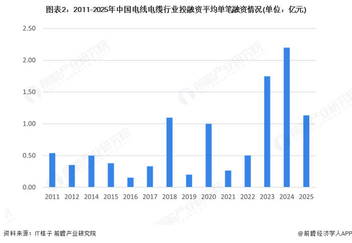 电线电缆行业作为传统制造产业,据IT桔子统计,2020年及之前国内融资事件较少;2021年,随着新能源的火热和智能电网等兴起,以及产业升级背景下对高端制造装备的需求,都进一步刺激了特种电线电缆的发展,具有核心研发技术优势的企业获得资本融资,投资数量从2020年的2起增长至2024年的9起;融资金额也从2020年的2亿元升至2024年的19.8亿元。2025年截至3月31日,我国电线电缆行业融资数量已有3起,金额累计已达3.4亿元。
