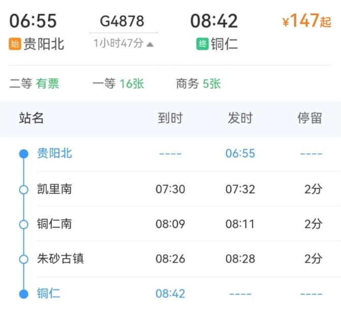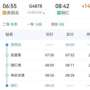 6月4日至6月29日,加开贵阳北至铜仁G4878次,贵阳北06:55开,铜仁08:42到。
