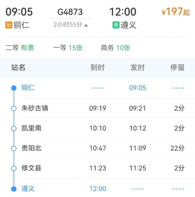 6月4日至6月29日,加开铜仁至遵义G4873/6次,铜仁09:05开,遵义12:00到。