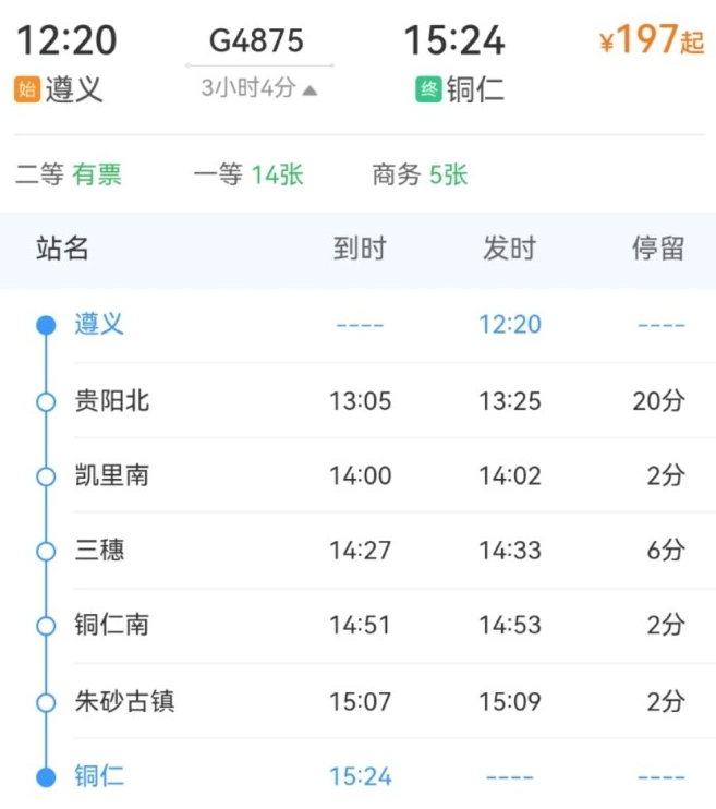 6月4日至6月29日,加开遵义至铜仁G4875/4次,遵义12:20开,铜仁15:24到。