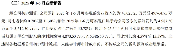经公司初步测算,公司预计2025年1-6月可实现的营业收入约为45025万元至49765万元,同比增长约0.70%至11.30%;预计2025年1-6月可实现扣非归母净利润约为4874万元至5387万元,同比增长约4.57%至15.58%。