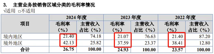 2022年、2023年、2024年,公司境内地区销售毛利率分别为21.40%、21.07%、21.40%,而境外地区销售毛利率分别为38.41%、37.59%、42.13%,分别比境内地区销售毛利率高17个点、15个点、20个点。