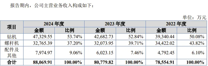 报告期内,公司钻机及工程螺杆机产品在矿山开采、基础设施建设、房地产建设等行业广泛应用。上述产品贡献收入合计占公司主营业务收入金额的比例分别为75.90%、80.06%和80.30%,占比较高且为公司主要收入来源。