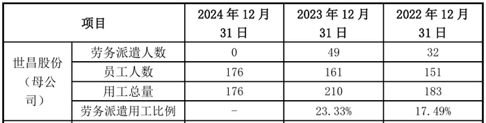 2022年、2023年,世昌股份的劳务派遣人数分别为32人、49人,占比17.49%、23.33%,超过10%。