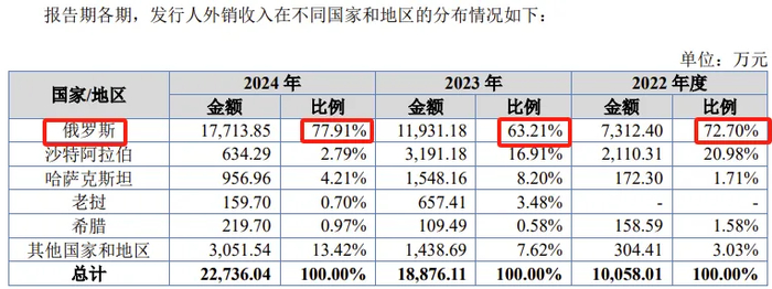 从外销国别来看,公司主要外销地为俄罗斯,2022年、2023年、2024年占外销收入的比例分别为72.70%、63.21%、77.91%。
