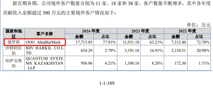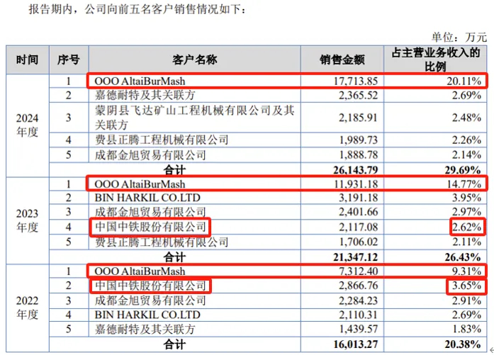 2022年、2023年、2024年,公司第一大客户均为OOO AltaiBurMash,分别贡献公司收入比例9.31%、14.77%、20.11%,持续上升。OOO AltaiBurMash为俄罗斯公司。