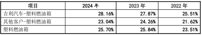 此外,报告期内,发行人向吉利汽车及其他客户销售塑料燃油箱的毛利率情况如下: