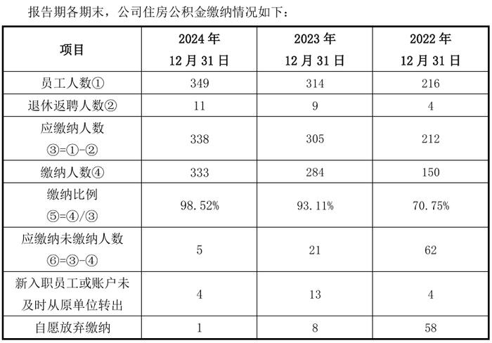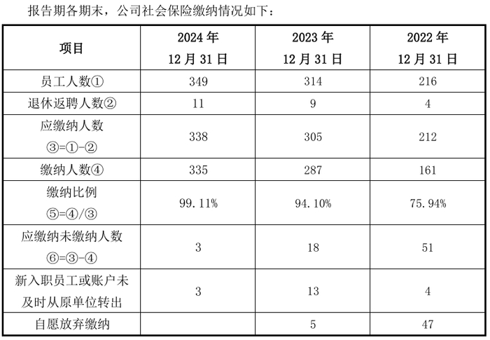报告期各期末,公司员工人数分别为216人、314人、349人,社会保险缴纳比例分别为75.94%、94.10%、99.11%,住房公积金缴纳比例分别为70.75%、93.11%、98.52%,存在部分应缴未缴的情形。