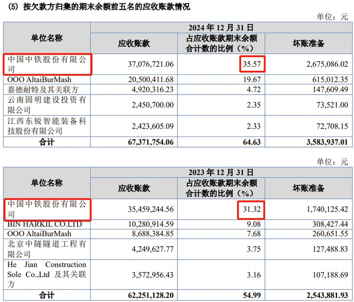 (2)第一大客户OOO AltaiBurMash为俄罗斯公司,中国中铁2024年跌出前五大客户名单