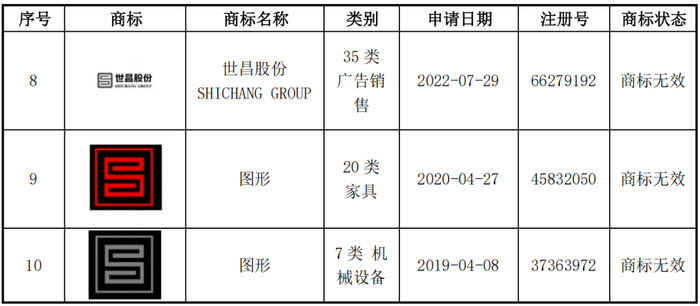 世昌股份曾于2019年至2022年间多次向国家知识产权局商标局(以下简称“商标局”)申请关于“世昌”“世昌LOGO”相关商标,但上述字样重名较多、商标造型较为常见,因存在近似商标等原因未能通过商标局的审查,发行人申请商标被驳回的具体情况如下: