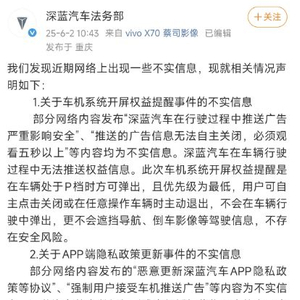 6月2日,深蓝汽车法务部发布声明,针对近期网络流传的多项不实信息进行逐一澄清。声明指出,“深蓝汽车在行驶过程中强制推送广告威胁行车安全”、“广告弹窗无法关闭需强制观看5秒”等言论均与事实不符。此外,部分网络内容发布的“恶意更新深蓝汽车 App 隐私政策等协议”、“强制用户接受车机推送广告”等说法亦属不实信息。