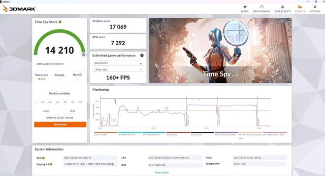 用户称其将 16GB 显存版本的 RX 9060 XT 显卡小幅超频 200 MHz,同时进行了 40mV 的降压,此时显卡频率提升至 3.47 GHz,功耗为 199W,Time Spy 显卡分数为 17069,总分为 14210,测试搭配 R5 5600 处理器,分辨率为 1080P。