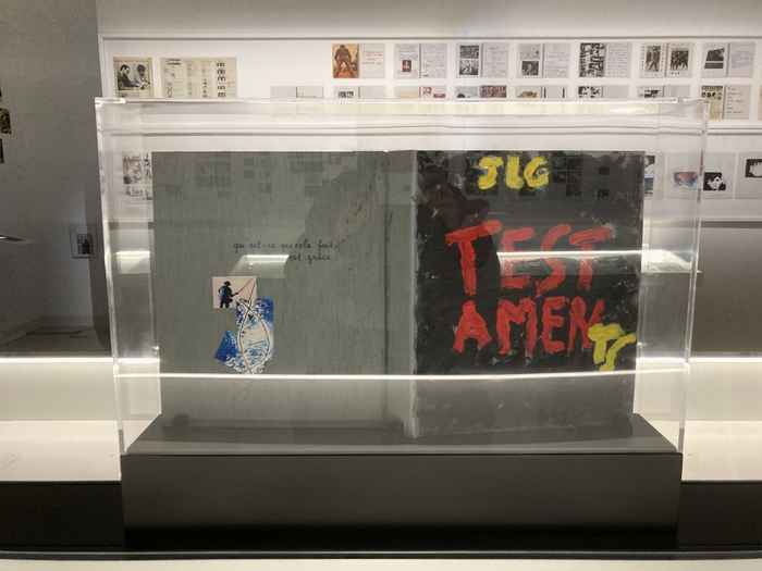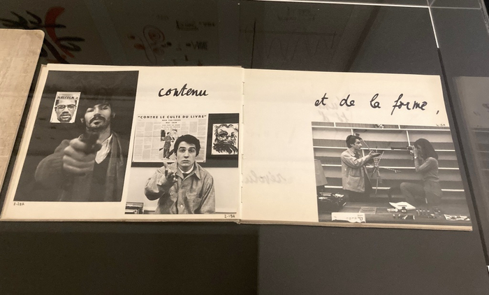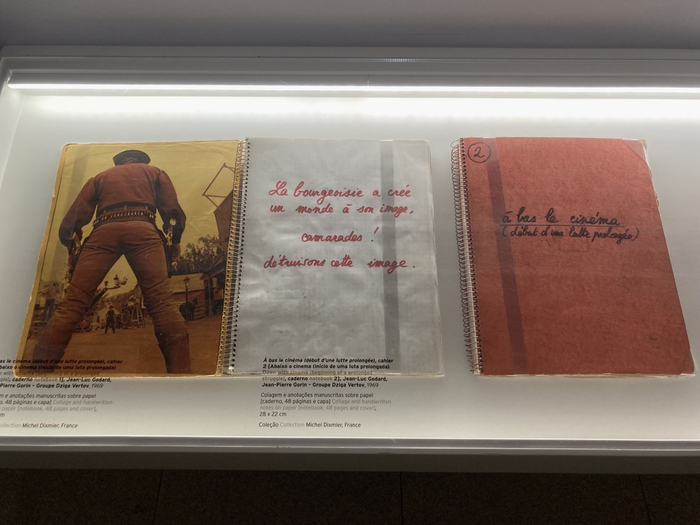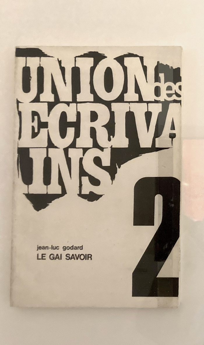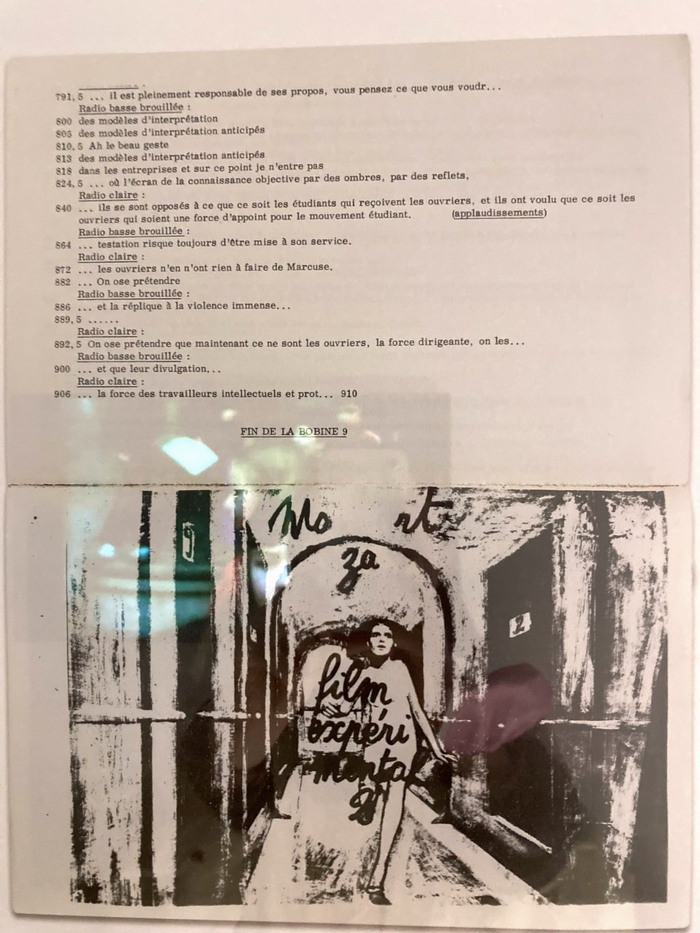 在戈达尔政治介入最直接激进的六七十年代,“工作笔记”的形式成了他建构自身政治理念及影像理论的拟稿。展览中几件难得一见的作品中有《第一次试录,卷二,“吉加·维尔托夫(电影小组)笔记本”(Take One, vol.2, n.11, ‘Dziga Vertov Notebook’, 1971)。吉加·维尔托夫电影小组(Le Groupe Dziga Vertov)由戈达尔与法国新闻记者及导演让-皮埃尔·戈兰(Jean-Pierre Gorin)在1968年共同发起,以苏联先锋实验电影的代表性导演维尔托夫为名,通过政治介入性的集体影像实践来响应支持欧洲当时各地的左翼运动。小组的另一部作品《打倒电影 (一场长期斗争的开端)》 (À bas le cinéma [début d'une lutte prolongée], 1969),用拼贴与手写注释,对消费主义社会与资产阶级影像所构建的社会之辩证批判。同一时期,引用尼采哲学书名的影片《欢愉的智慧》(Le gai savoir, 1968) —— 戈达尔首次受法国电视台委托拍摄的作品,最终因影片对时任政府的批判而被法国国家广播电视(ORTF)禁止放映。因顾虑多年后影片仍有可能被公映而对法国政府形象造成不利影响,审查处同时要求戈达尔对影片的“政治敏感”处进行删减。戈达尔便用连串bip的噪音盖住影片中演员对话的“敏感部分”,以此凸显影片四处被审查的痕迹。1969年4月,作为作家联合会(Union des écrivains)的成员,戈达尔在联合会刊物的第二期上转录刊登了《欢愉的智慧》完整的对话台词。成立于1968年“五月风暴”期间的作家联合会,由法国文化界200多位作家共同联名发起(包括波伏娃,杜拉斯,萨特,莫里斯·布朗肖[Maurice Blanchot],艾美·塞泽尔[Aimé Césaire],乔治·佩雷克[Georges Perec],皮埃尔·科罗索夫斯基[Pierre Klossowski]……),试图通过文化与艺术的创作去反思并改变法国社会的经济与文化结构。获悉《欢愉的智慧》中的对话被审查,深知戈达尔的影片对当时社会的批判及对文化自身作用的反思,作家协会公开支持影片对话的发表,不仅将《欢愉的智慧》视为“五月风暴”中艺术先锋的表率,并希望以此行动作为对68时期批判精神的延续。在刊出每句台词的开头,戈达尔还标示了根据影片最终35毫米拷贝胶片上以米制计算的镜头标记,以此与被审查的影片对照,见证性地质问了当时政府在文化与意识形态上的审查制度。