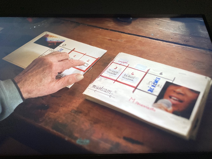 影片静帧。戈达尔/法布里斯阿拉尼奥/让-保罗·巴塔吉亚,短片《“影片‘剧本’预告片”的叙述展示》,2024, 彩色录像,20分钟。