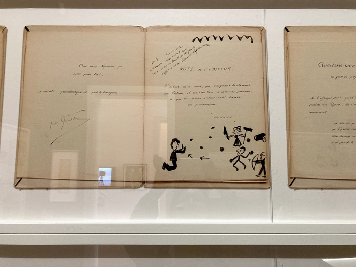 例二:在戈达尔平时的阅读批注中,思辨性的介入构成了另一种图文拼贴实验。比如法国十七世纪数理科学家布莱兹·帕斯卡尔(Blaise Pascal, 1623-1662)著名的《思想录》(Pensées, 1670),或是加缪(Albert Camus,1913-1960)的哲学随笔《西西弗斯的神话》(Le Mythe de Sisyphe, 1942),少年戈达尔在书本的扉页或内页上抄录引用了不同时代各个领域作者的词句,形成多组文词语句的绮丽蒙太奇。关于法国诗人及作家阿尔弗雷德·雅里(Alfred Jarry, 1873 - 1907,启发超现实主义运动的诗人之一) 的文学奇作《荒诞玄学家福斯特罗尔博士的业绩和见解》(Gestes et opinions du docteur Faustroll, 1911),戈达尔为小说自制一张抽象绘图的书套,表现故事在他眼中的意象。