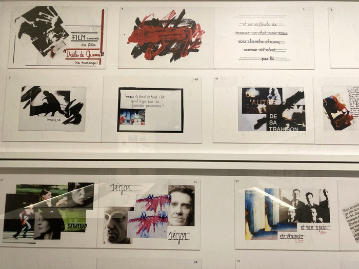 而在一些影片的筹备笔记中, 比如《激情》(Passion, 1981),《玛丽,我向您致意》(Je vous salue, Marie, 1984),《跟语言道别》(Adieu au langage, 2014),文字与图像间,有时两者同等重要,有时以图像为主体,有时图像则完全替代了文字。当文字作为主体时,从文字的排版及其相对图像所出现的形式(导演的手写,引用词句的剪贴等), 文字本身形成了另一幅画面。文字在此很少为叙事存在,而更多以引用、文字游戏、惯用语句程式、提问或思虑的形式出现。这些手写与拼贴的图文笔记所引出的思辨,摒弃了剧情构造与描述,通过直击影片作为影像本身的核心而呈现出剧本。