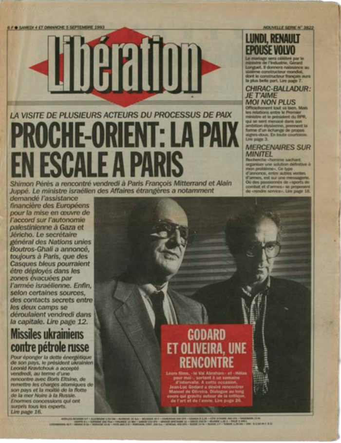 1993年9月4日与5日,法国《解放》日报周末特刊头版上戈达尔与奥利维拉对谈的报道。同一版面还有关于巴以冲突在当年中东和平进程中的谈判以及乌克兰与俄罗斯在对核武器及黑海舰队的主权上的双边协商的报道。