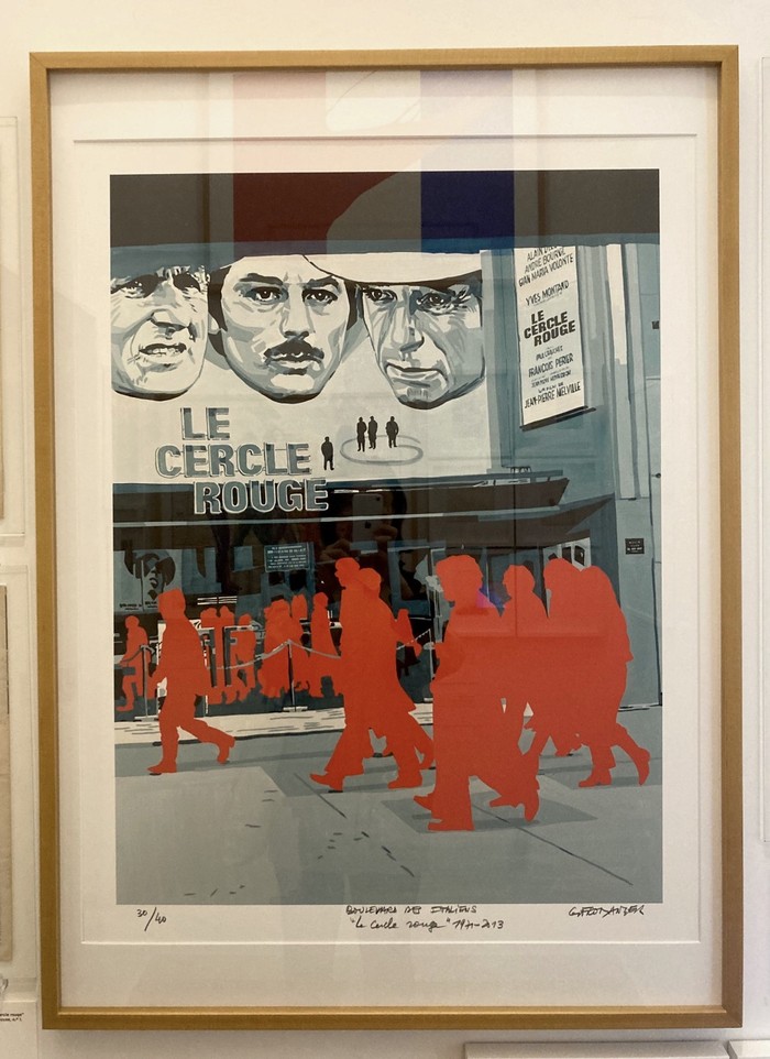 弗罗芒格在1968年前后,以“红色”为主色的系列画作:批判消费主义社会的《意大利人大道:红圈》(Boulevard des Italiens: Le Cercle rouge), 1970,哈内姆勒艺术纸上的涂料印花,91x70cm,由弗罗芒格署名并编号。Nicole Brenez个人收藏,巴黎。(注:《红圈》[1970]为法国电影导演让-皮埃尔·梅尔维尔[Jean-Pierre Melville]的影片,由阿兰·德龙主演。)