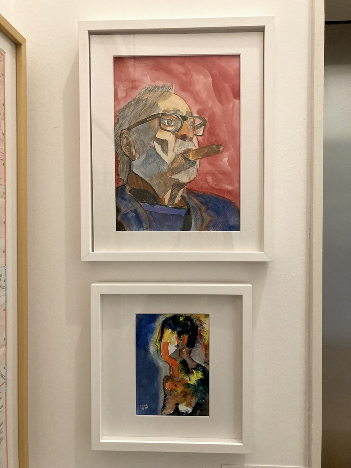 亨利·特拉福雷蒂画笔下的戈达尔。 上:《抽雪茄的导演。不是一幅正确的图像,只是一幅图像》(Cinéaste au cigare. Pas une image juste, juste une image),2020年6月,纸上水粉,30x22cm。Nicole Brenez个人收藏,巴黎; 下:《无题》(Sans titre),2017,亚克力颜料绘画,18x13cm。Nicole Brenez个人收藏,巴黎。