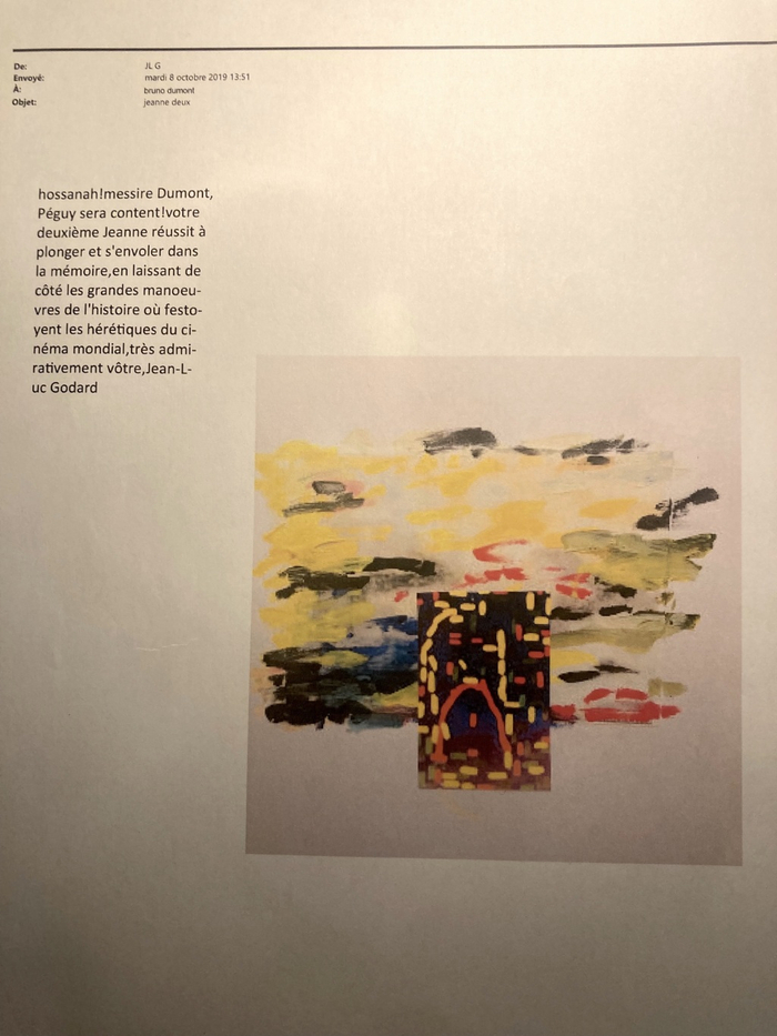 2019年10月8日,戈达尔致法国导演布鲁诺杜蒙(Bruno Dumont)的电子邮件。杜蒙根据法国作家查尔·贝矶(Charles Peguy,1873-1914)关于圣女贞德的剧作改编拍摄了《简那》(Jeanne, 2019),戈达尔在信中用文图拼贴表示对影片的喜爱与欣赏。
