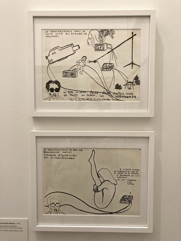 展览入口走廊一侧有一个小空间,它既可以是观展的开始,亦可作为离开前的停留。在这一局促却丰富的“集体空间”,展出了戈达尔创作生涯一路走来身边亲友及合作伙伴的作品。一直质疑“作者”(auteur)这一身份而更倾向于无产阶级集体言行的戈达尔,在此处能从另一个角度看他创作中的共生性。有自小教他画画的姐姐拉谢尔·戈达尔(Rachel Godard)的一组绘图;与戈达尔亦师亦友的法国电影资料馆创始人亨利·朗格卢瓦(Henri Langlois, 1914-1977)对电影影像自由多元的理念及在电影资料馆展映策划中的具体实施,影响了整一代法国新浪潮电影的导演,特别是特里弗和戈达尔。1968年2月,当法国文化部提出撤换朗格卢瓦资料馆馆长的职位并介入电影资料馆的管理,瞬即引来卓别林、希区柯克、库布里克、奥逊·威尔斯等各地电影人的抗议。在法国当地,戈达尔起头与新浪潮多名导演公开为朗格卢瓦辩护,指责政府以经济利益为目的而干涉电影文化的自由,并集体上书请愿要求保留朗格卢瓦馆长的职务。展览中“朗格卢瓦事件”期间这一公众行为的图文档案,鲜活地再现了这一历史时刻,当时更有不少学者将此事件视为法国1968年“五月风暴”真正的前奏;在穿越“五月风暴”中与戈达尔相识的法国视觉艺术家热拉尔·弗罗芒格(Gérard Fromanger, 1939-2021,亦是法国六七十年代“叙事具象”画派[Figuration Narrative]的代表人物之一),两人联手创作的三分钟短片《传单影片第1968号 — 红色》(Film-tract n°1968 - Le Rouge, 1968),戈达尔拍摄弗罗芒格制作其著名系列海报作品《红色》(Le rouge, 1968)的过程 —— 让充满象征的法兰西共和国国旗红色部分逐渐流淌,昭示了绘画行动在此时期的纯色抗议;1967年至1974年,在法国东部贝桑松(Besançon)和索绍(Sochaux)等多个城市发起罢工运动时期,由克里斯·马克(Chris Marker, 1921-2012)和一群左翼电影人发起,由工人一同加入组建了社会影像集体梅德韦德金小组(Groupe Medvedkine)。戈达尔对此积极支持回应,和其他电影人一起去工厂参与工人的讨论,教他们电影拍摄技术,让工人自己拍摄记录他们的工作与生活。近半个世纪后,画家和雕塑家亨利·特拉福雷蒂(Henri Traforetti),当年首批加入小组拍摄的工人之一,展出了他在记忆与现实之间所绘的戈达尔肖像;七十年代末,戈达尔与瑞士作家及导演安娜-玛丽·米埃维尔(Anne-Marie Miéville)共同拍摄的六集录像作品《 法国,环行,绕道,两个孩子 》(France, tour, détour, deux enfants, 1978),其中小女孩的扮演者卡米尔·维罗洛(Camille Virolleaud)多年后亦成为画家,在此展出她带有女权主义幽默隐喻的画作;身为戈达尔工作及生活伴侣的米埃维尔于1975年一组取名《无题》(Sans titre)的图绘作品,似是两人早期合作拍摄并同时出演的影片《软与硬》(Soft and Hard, 1986)的简要,如影片副标题所示:“两个朋友就硬性话题展开的软语讨论” (Soft Talk on a Hard Subject Between Two Friends)。
