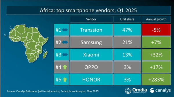 非洲市场前五名分别为传音、三星、小米、OPPO、荣耀;