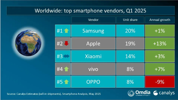 【CNMO科技消息】近日,调研机构Canalys公布了2025年第一季度的全球智能手机市场最新数据:出货量达2.969亿台,同比增长0.2%,以下是具体的市场排名: