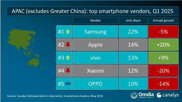 亚太市场前五名分别为三星、苹果、vivo、小米、OPPO;