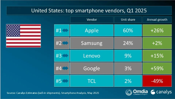 美国市场前五名分别为苹果、三星、联想、谷歌、TCL。