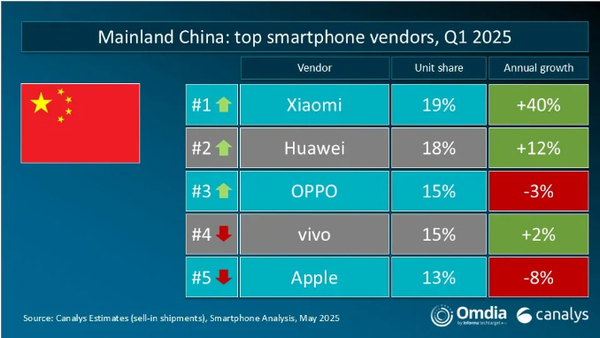 2025Q1全球手机市场排名:小米出货四千万部居第三