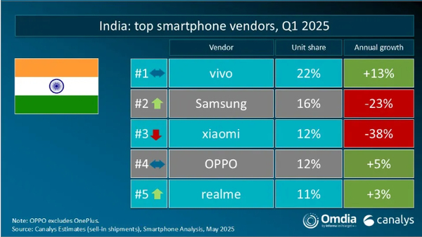 印度市场前五名分别为vivo、三星、小米、OPPO、realme真我;