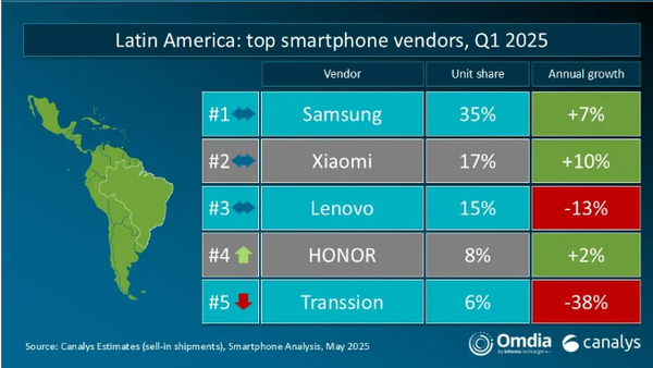 拉丁美洲市场前五名分别为三星、小米、联想、荣耀、传音;