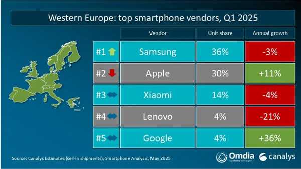 西欧市场前五名分别为三星、苹果、小米、联想、谷歌;