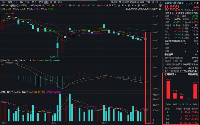 6月3日 ,A股芯片板块走强,科创芯片50ETF(588750)放量上涨1.52%,上个交易日再度吸金超1400万元,资金持续看好高景气的科创芯片板块,科创芯片50ETF(588750)近20日累计吸金超1.2亿元。截至最新,科创芯片50ETF(588750)基金份额达14.71亿份,创上市以来新高!