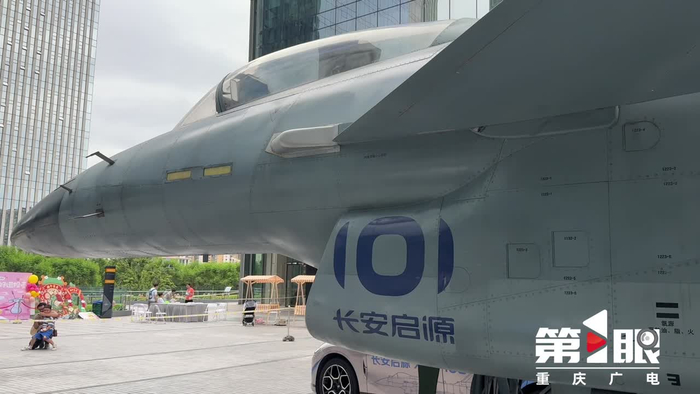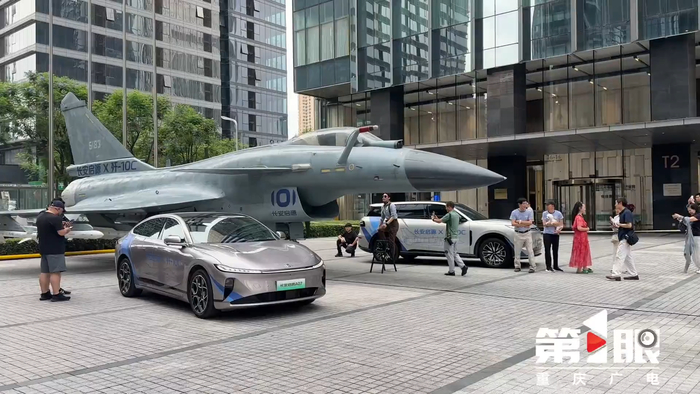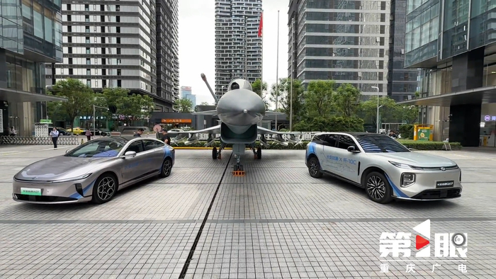 在重庆江北嘴,一架1:1还原的“歼-10C”战斗机与两台“重庆造”新能源汽车形成并驾齐驱之势。