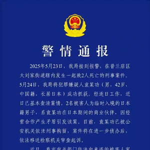 2025年5月23日,我局接到报警,在普兰店区大刘家街道辖内发生一起致2人死亡的刑事案件。5月24日,我局将犯罪嫌疑人袁某功(男,42岁,中国籍,长居日本)成功抓获。经连日工作,近日已基本查清案情。2名被害人为临时入境的日本籍男子,系袁某功在日本期间的商业伙伴,因经营合作产生矛盾引发该案。目前,袁某功已被公安机关依法刑事拘留,案件将在进一步侦办后,依法移送检察机关审查起诉。
