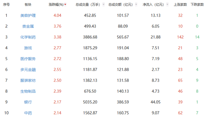 行业板块方面,美容护理、贵金属、化学制药、游戏等板块涨幅居前,钢铁、汽车整车、白酒、煤炭开采加工等板块跌幅居前。