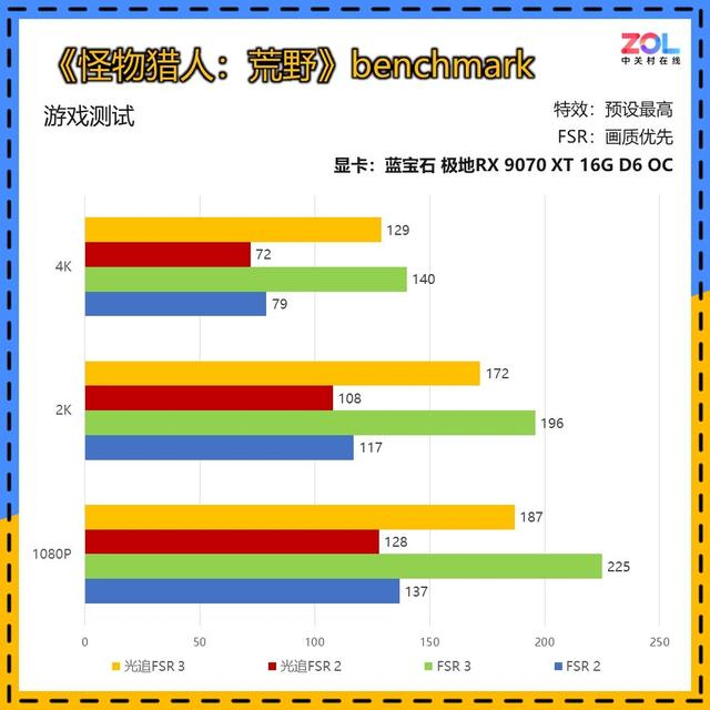 蓝宝石 极地RX 9070 XT 16G D6 OC在《怪物猎人:荒野》的表现比较令人惊叹,可以看到在4K分辨率下,开启FSR 3后,即便打开光线追踪也能达到129帧,相比无光追的帧数仅差10帧左右,性能还是非常强悍的。