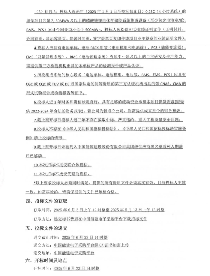 标包3:投标人近两年(2023年1月1日至投标截止日)0.25C(4小时系统)的单体项目容量为50MWh及以上的磷酸铁锂电化学储能系统集成设备(至少包含电池室/舱BMS、PCS)累计合回业绩不低于500MWh。
