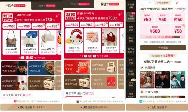 通过88VIP,阿里将分散的业务线比如淘宝、天猫、优酷、饿了么、夸克、网易云音乐等会员权益整合为「一卡通」,构建了一个覆盖「吃玩听看买」的超级会员生态。2023年10月,88VIP细分为生活卡、购物卡、全能卡三种套餐。