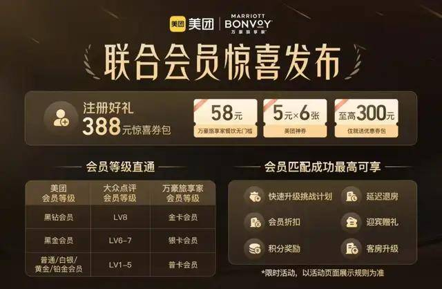 5月29日,美团宣布与万豪的会员权益正式打通。美团黑金会员对标万豪银卡,黑钻会员对标金卡,新注册的万豪会员还可获得58元、30元免费券。