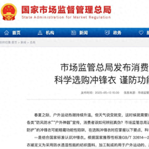 国家市场监管总局5月13日发布的消费提示进一步细化了选购标准,其中强调,在选购冲锋衣时,消费者应重点核查吊牌信息。冲锋衣吊牌需明确标注“冲锋衣”品名,执行标准为GB/T 32614—2023《户外运动服装 冲锋衣》或与产品相匹配的冲锋衣企业标准等。
