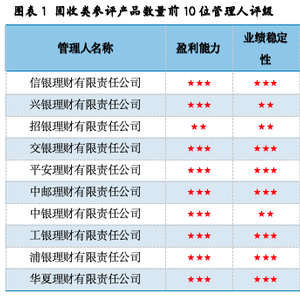 固收类产品是银行理财最重要的产品线。旗下产品济安评级总星数的五星评级的理财公司意味着其固收类产品兵强马壮。济安金信最新一期固收类产品参评数量前十位的银行理财产品管理机构及管理人管理能力五星评级的理财公司有:信银理财有限责任公司、招银理财有限责任公司、兴银理财有限责任公司、交银理财有限责任公司、华夏理财有限责任公司等10家理财公司。