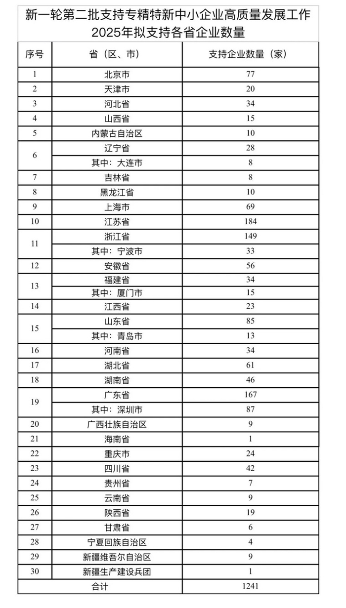 5月30日晚,工信部发布了《新一轮第二批支持专精特新中小企业高质量发展工作2025年拟支持各省企业数量》。本次共计支持企业数量1241家,以下是部分省份及城市的支持企业数量。