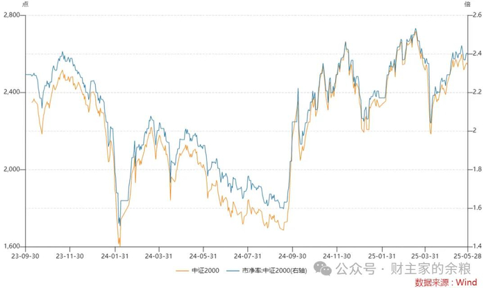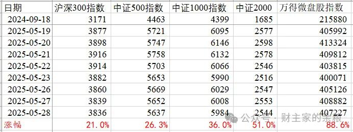 更进一步,从2024年9月18日的低点到2025年5月28日,不考虑微盘股指数的话(因为其市值规模太小,不具有代表性),在A股的主要宽基指数里,中证2000是涨得最多的那个。