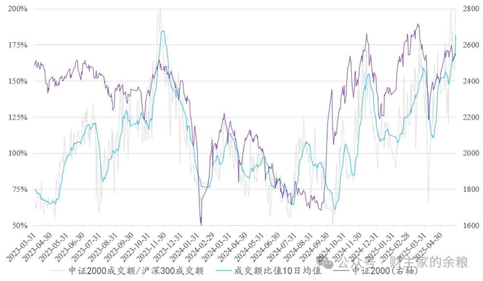 更进一步,为了避免受到某一两天数据的干扰,为了将一段时期内市场对小盘股的追捧情绪体现出来,我将中证2000成交额/沪深300成交额(下图灰色线)做了一个10日平均(下图浅蓝色线),这样一下子就能看出来市场情绪与中证2000指数高低的关系。