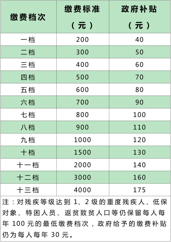 调整后的个人缴费档次为每人每年缴费300元、500元、800元、1000元、1500元、2000元、3000元、4000元、5000元、6000元。