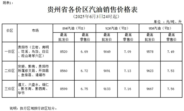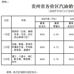 按照国家调整要求和相关规定,贵州省89#汽油(国VIB)、0#柴油价格每吨在现行标准基础上分别提高65元、60元,具体价格可由各经营企业在不超过最高批发、零售价格的前提下确定。