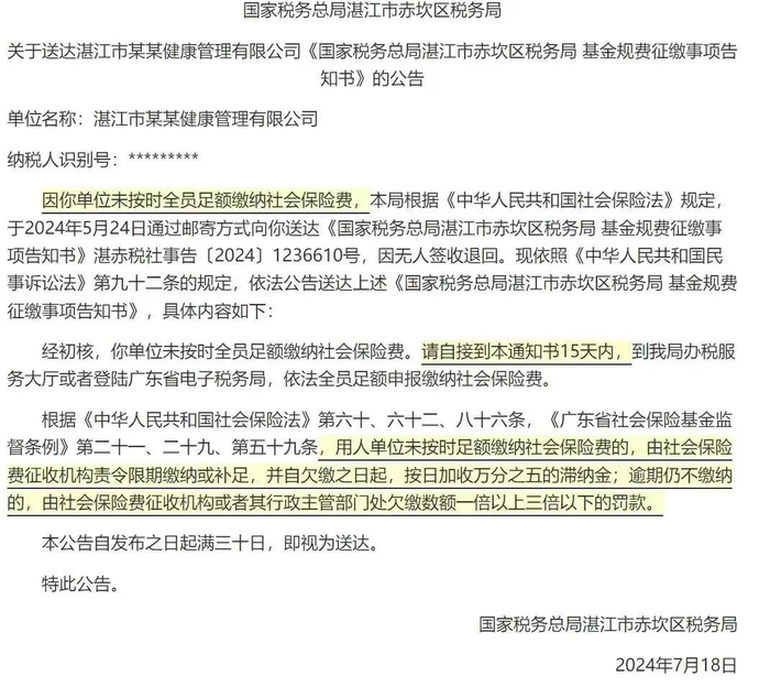 某公司此前收到一份由税务局下发的《社会保险费事项通知书》: